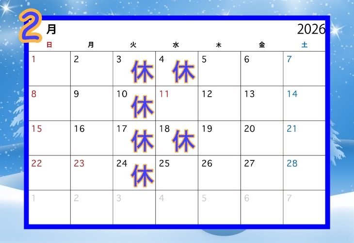 2月のお休みはこちら!ご確認お願いします!!